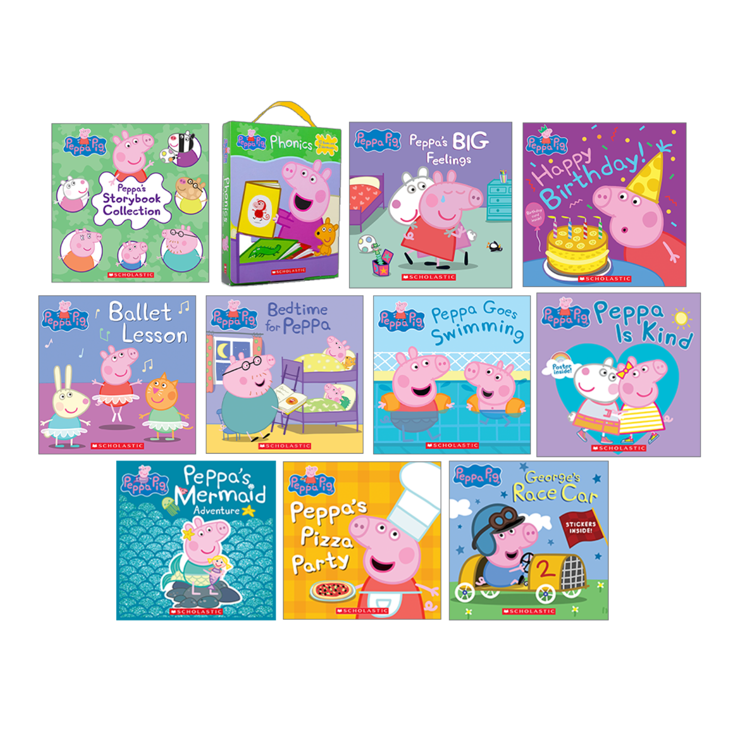 Cette merveilleuse collection de 11 livres de Peppa Pig comprend.. : Peppa Pig : Recueil de sept histoires, Peppa Pig : La boîte à lecture, Peppa Pig : Peppa et les émotions, Peppa Pig : Joyeux anniversaire, Peppa!, Peppa Pig : La leçon de ballet, Peppa Pig : Bonne nuit, Peppa, Peppa Pig : Peppa à la piscine, Peppa Pig : Peppa est gentille, Peppa la sirène, Peppa Pig : La journée pizza, et Peppa Pig : La voiture de course de George.