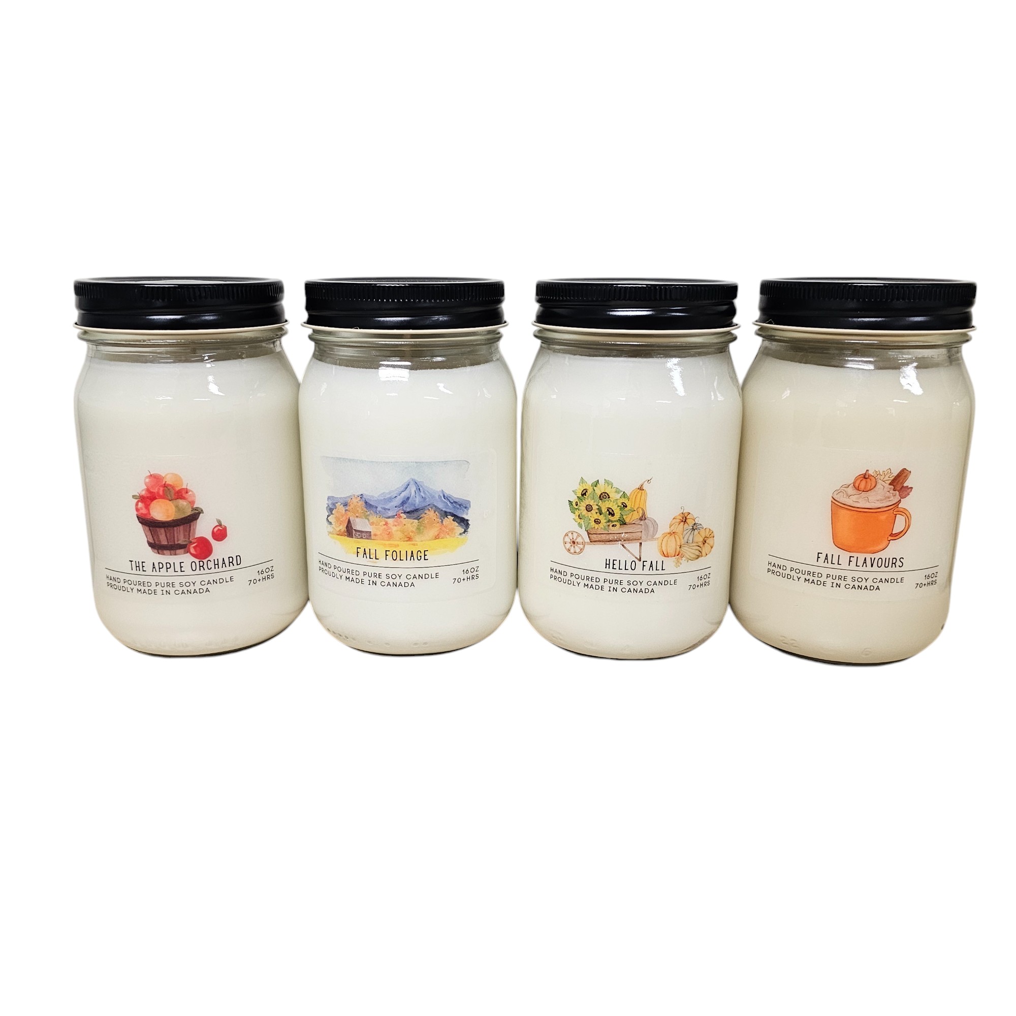 The Fall FOUR PACK – Enjoy our four newest Fall Favourites with this rustic inspired candle collection. Each Box will come with FOUR 16oz Mason Jar Candles as shown in picture. FRENCH AND ENGLISH