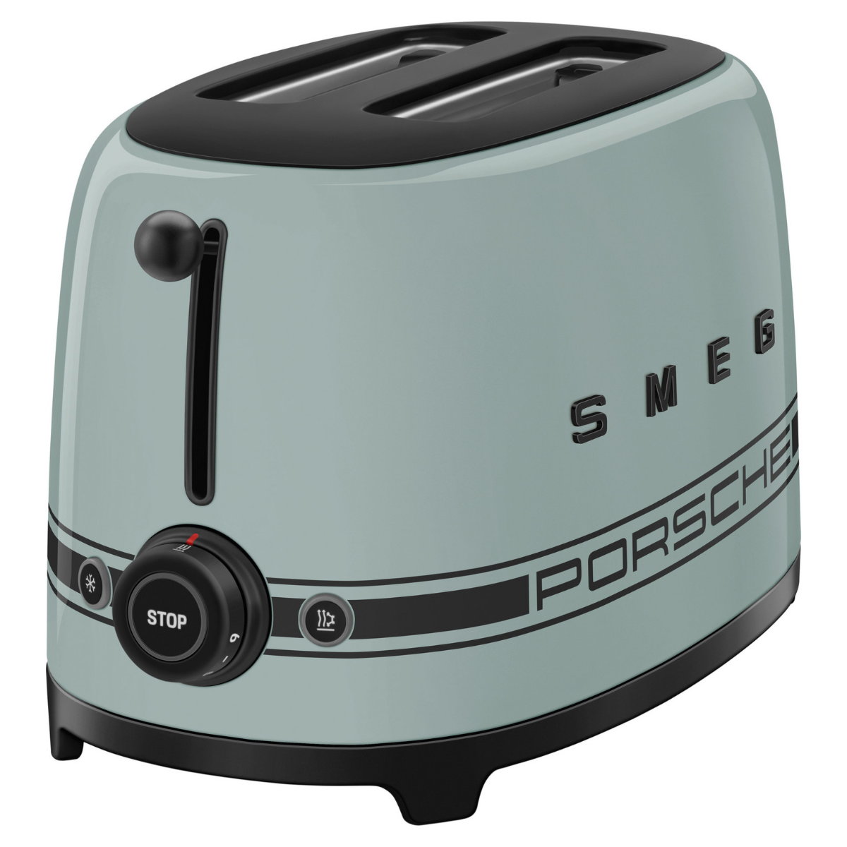 The Porsche x SMEG Toaster combines iconic design and functionality. Inspired by 50’s style, it features the signature Porsche stripe across the body and refined details like matte black accents. The custom-designed interface—featuring the numbered control knob and dedicated function buttons—adds a distinctive and sporty touch