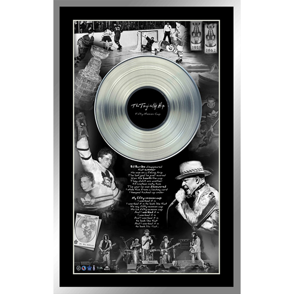 This unique framed piece features the combination of music from Canadian Icons as well as hockey – and more specifically the Toronto Maple Leafs. This frame features a collage in the background of Bill Barilko, the last goal he scored, related Stanley Cup banners, as well as The Tragically Hip. Lyrics from the famed song Fifty-Mission Cap are featured front and centre of the frame and provide The Hip’s account of Barilko’s unique and infamous story and the tragedy associated with it. In the fore-ground of the frame is a replica platinum LP which signifies the success of the song, which is one that many Canadians an find themselves humming along to when they hear it. This product is officially licensed. Frameworth is the official memorabilia provider of The Tragically Hip. Finished size: 28.5″x38″
