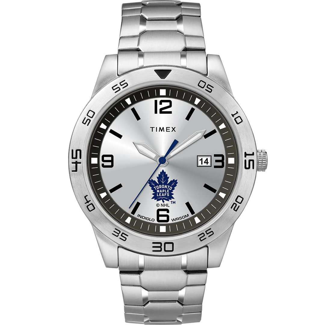 Show your true blue and white Toronto Maple Leaf colours. This is a signature look for any fan. The Toronto Maple Leafs logo is right on the dial of one of our most refined looks. With a brushed steel finish, and polished details on the bracelet this watch looks good enough for the owner’s box. The Maple Leaf logo is right on the dial. Stainless Steel Expansion Band. Removable links let you customize the fit so your watch sits exactly where you want it and slips off with ease. Water Resistant to 50 Meters. This watch is suitable for light swimming. It is not suitable for snorkelling, or poolside diving. To maintain water resistance, do not press any buttons while underwater. INDIGLO® Light-Up Watch Dial. Developed by Timex in the early 90s, our INDIGLO® night light allows you to tell the time in the dark with the push of a button. Date Window. This watch dial incorporates a date window, offering convenient access to the current date.