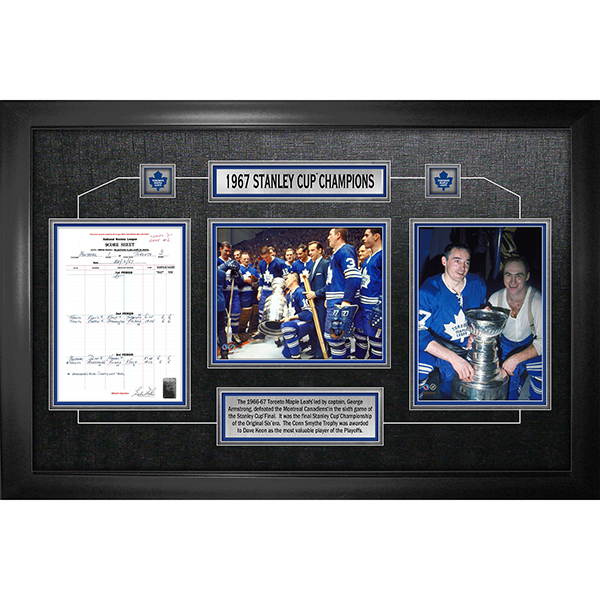 This commemorative 1966-67 Stanley Cup frame showcases two 8×10″ photos, and an exact NHL licensed replica copy of the scoresheet from the final game in 1967. The descriptive metal plate at the bottom of the frame recaps the glory of the championship and reads the following: “The 1966-67 Toronto Maple Leafs’ led by captain, George Armstrong, defeated the Montreal Canadiens’ in the sixth game of the Stanley Cup Finals. It was the final Stanley Cup of the Original Six era. The Conn Smythe Trophy was awarded to Dave Keon as the most valuable player of the playoffs. The finished frame size is 25″x36″x1”. The frames are a part of a four frame collection that showcases all of the most recent Stanley Cup victories for Canadian NHL franchises.