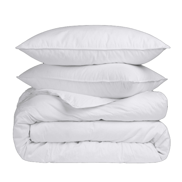 This bundle includes a mixed down/feather duvet and 2 matching pillows. It is not as hot as pure down duvet as the feather create more air space. Shell: 233 Thread count, 100% combed cotton, down proof,