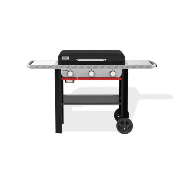 Step up to a premium flat-top grilling experience with the sleek and stylish 28” Slate™ Rust-Resistant Griddle. Start sizzling fajitas, smashing burgers, and stir-frying right out of the box on the pre-seasoned carbon-steel cooktop that stays ready, not rusty, use after use. This griddle quickly reaches over 500ºF and provides even heat across the surface. Wind guards prevent the burners from blowing out, and the cooktop is set close to the burners to keep the temperature steady. Three precision-control burners allow for multi-zone heat, so you can cook perfect pancakes on low and crisp up bacon on high all on the same cooktop. No use of coatings means you can use metal tools to flip, press, and scrape without worry. Plus, the side table rails are compatible with Weber Works™ snap-on accessories, so you can keep cooking and cleaning supplies within reach (accessories sold separately).